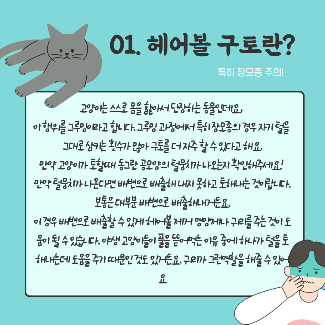 고양이 머리볼 토장모종 고양이가 두 마리 있는 집에 고양이 머리볼 흙은 매우 친숙한 일이다. 처음에는 이상한 똥같은걸 입으로 뱉으면 이게 뭐야!! 도대체!이물질을 먹었구나!! 하고 사진을 찍어놓고 병원에 데려간 그게 한두 번 반복돼서 익숙해지기 시작했는데 익숙하다고 아이들이 토할 때마다 마음이 아프지 않은 건 아니라는 걸 한탄하며 헤어볼 토의 주기를 늘리기 위해 관리를 열심히 하는 편이다.아무리 케어를 해도 목욕 직후에는 항상 헤어볼을 토하고 그 이유와 관리법에 대해 이야기해 본다!