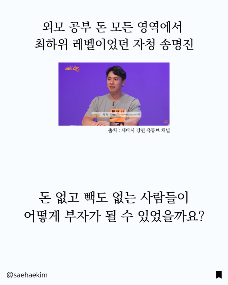 돈도 없고 인맥도 없다면 이 4가지만 기억하세요. 3번 자살 시도했던 20대 청년이 세이노비즈니스에서 억만장자가 됐습니다. 15년 동안 7번 실패하고 8번째 성공한 김승호. 돈도 인맥도 없는 사람들이 어떻게 부자가 될 수 있을까요? 평범한 사람들이 원하는 결과를 어떻게 이룰 수 있을까요! 이 4가지 방법으로 돈도 인맥도 없이도 재정적 자유에 더 가까이 다가갈 수 있습니다. 1. 정기적인 수입을 창출하세요! 꾸준한 수입으로 바꿔보세요. 꾸준히 들어오는 돈은 한꺼번에 재산을 모으는 것보다 더 강한 힘이 있습니다. 2. 능력이 안 된다면 트레이딩은 NO! 단호한 거부로 감정과 시간, 에너지를 확보하세요. 3. 남의 돈을 내 돈처럼 존중하세요! 남의 돈을 대하는 방식이 진짜 내 돈을 대하는 방식입니다. 남이 돈을 낸다고 비싼 걸 주문한다면 그건 돈을 존중하지 않는 겁니다. 내가 돈을 존중하지 않으면 돈은 나를 떠날 겁니다. 4. 지출하지 말고 투자하세요.