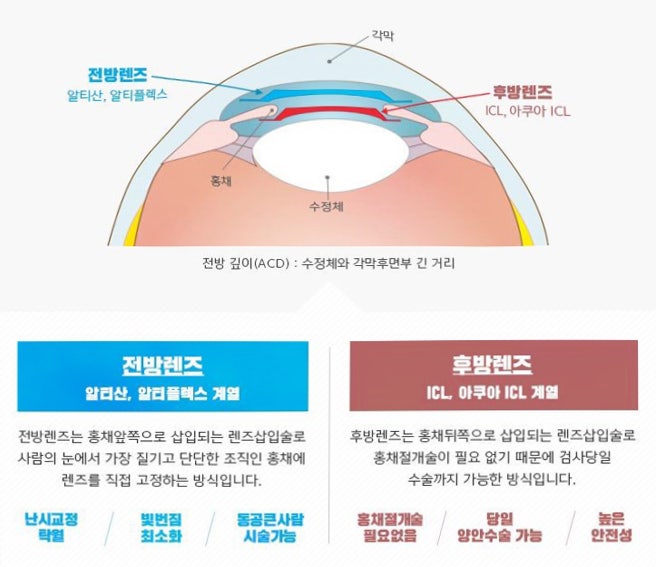시력교정 효과는 앞이나 뒤나 마찬가지입니다. 후방 렌즈는 홍채 뒷면에 렌즈를 넣지만 홍채 뒤쪽 공간에 쉽게 삽입할 수 있습니다. 그런데 전방 렌즈의 경우 홍채 앞에서 홍채를 꼬집듯이 씹어서 고정시킵니다. 그렇기 때문에 렌즈가 회전할 확률이 적습니다. 하지만 후방 렌즈의 경우는 특별히 고정시키지 않았기 때문에 수술 후 눈 안에서 렌즈가 회전할 가능성이 있습니다. 그러면 난시가 조금 재발할 수 있습니다. 후방 렌즈