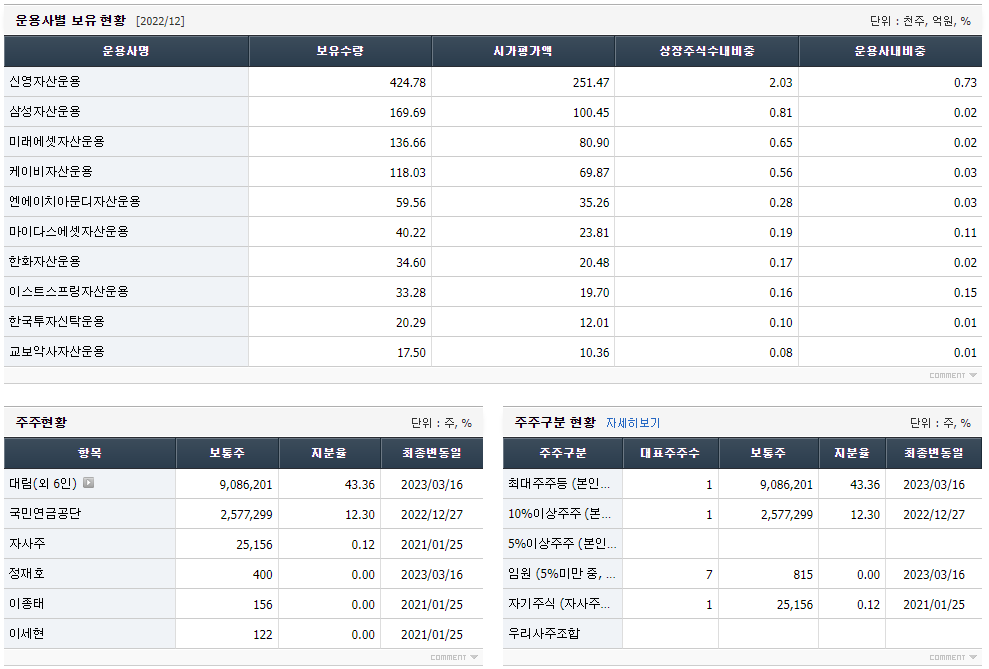 단기 거래를 하는 경우에는 주주현황 정보가 필요없지만, 장기적으로는 회사의 가치를 살펴보고 분석하기 시작할 때 경영현황과 역량을 살펴보는 것도 필요합니다. 대주주에게 직접 질문을 할 수는 없지만, 어떻게 설정되어 있는지 살펴보는 것이 좋습니다.